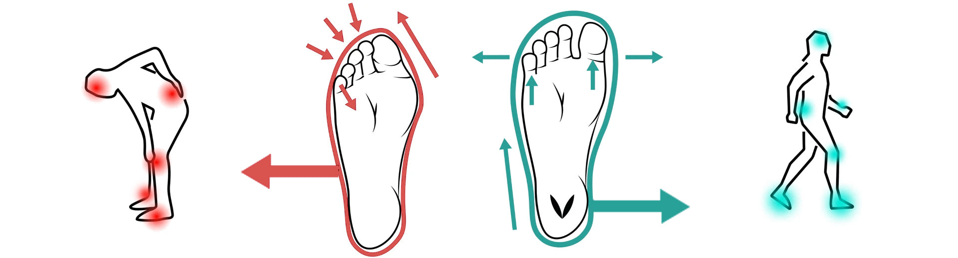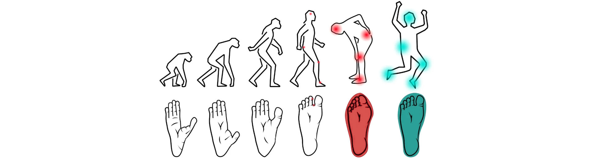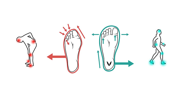 Typical footwear, with tight toe boxes, raised heels, and rigid, thick soles, creates an unnatural setting for your feet.